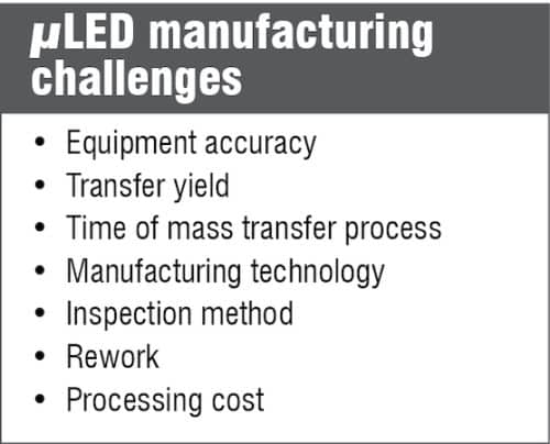 Imagine making a µLED TV panel. It may roughly require about 24 million individual µLEDs, which means manufacturing 24 million µLEDs and then transferring them to backplane of the TV. This mass transfer is the unresolved bottleneck for panel manufacturers.