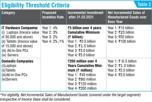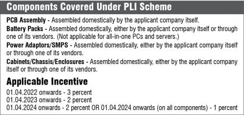 The scheme shall extend an incentive of four percent to two/one percent on net incremental sales (over base year) of goods manufactured in India and covered under the target segment, to eligible companies, for a period of four years. The target segment under PLI for IT hardware includes laptops, tablets, all-in-one PCs, and servers.