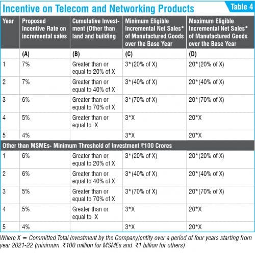 A total budgetary outlay of 121.95 billion rupees has been announced for the scheme. The year 2019-20 has been set as the base year of this scheme. The list of specified telecom and networking products under the scheme include core transmission equipment, 4G/5G, next-generation radio access network and wireless equipment, access and customer premises equipment, IoT access devices and other wireless equipment, enterprise equipment including switches and routers.