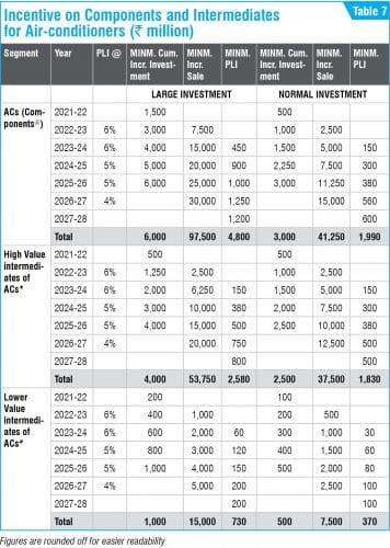 The primary aim of this PLI is to remove sectoral disabilities, create economies of scale, enhance exports, and create a robust component ecosystem and employment generation. The components of the ACs included in the scheme are aluminium foil, copper tube, compressor (rated as high-value intermediates) and PCB assembly for controllers, BLDC motors, service valves for ACs, cross-flow fans along with other components (rated as lower-value intermediates).