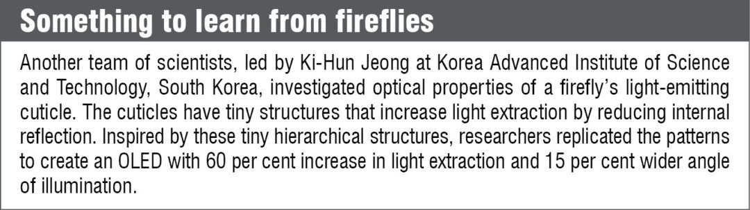 A team led by Prof. Tae-Woo Lee, department of materials science and engineering, Pohang University of Science and Technology, South Korea, used pure organic TADF emitters that show very high internal quantum efficiency of nearly 100 per cent without precious metals. Easy synthesis due to use of pure organic molecules reduces synthesis cost. This is a big leap towards the development of inexpensive and solution-processed OLED displays and solid-state lighting.