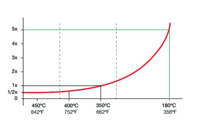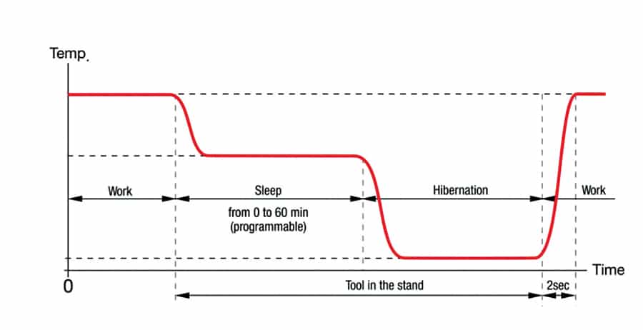 Tip life increases exponentially by using lower temperatures. Using the sleep mode, the average temperature can be further reduced, which can extend a tip’s life five times. The sleep mode automatically lowers the tip temperature below the solder melting point when the tool rests in its stand. It prevents the dissolution of the tip’s iron coating into molten solder.