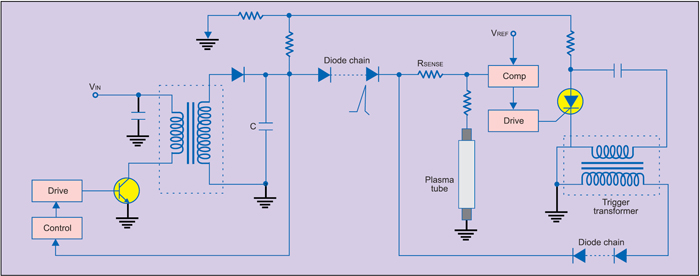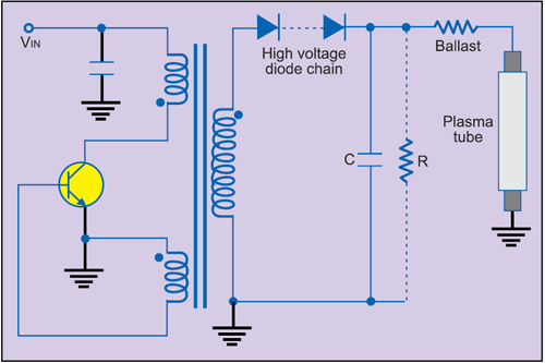 In the second commonly used circuit topology, the DC power supply is connected directly to the plasma tube through the ballast resistance. A high-voltage trigger pulse of 10-15kV is applied to the tube to initiate the discharge. Once gas mixture is ionised, the DC power supply takes over to sustain the discharge.