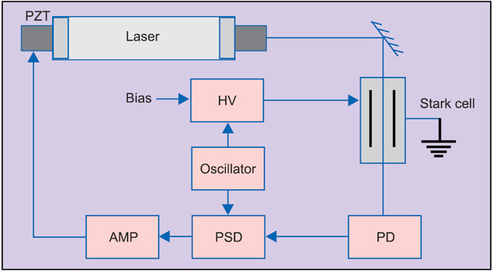 A part of the output laser beam is made to pass through the stark cell. An appropriate value of DC voltage is applied to one of the stark plates to make the stark-shifted molecular transition of the gas contained in the cell precisely coincide with the carbon dioxide laser output line of interest. A slowly varying linear voltage ramp may be applied instead. Also superimposed on this is a relatively high-frequency sinusoidal or square waveform. The frequency is 5kHz, typically. The beam at the output of the stark cell is thus modulated in both amplitude and frequency by the applied high-frequency signal around the line of interest.