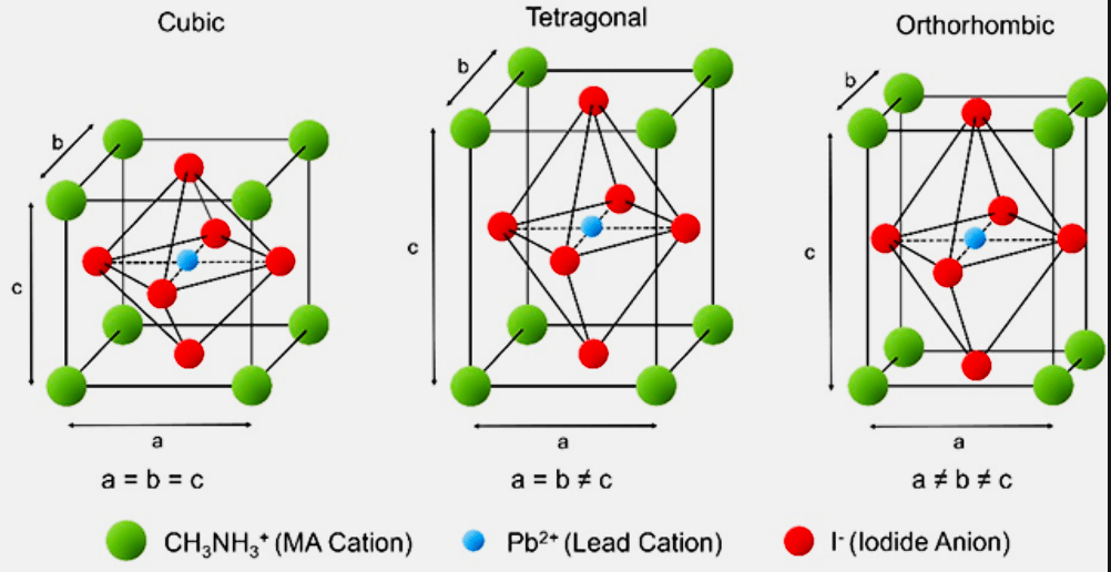 The cubic unit cell of 3D hybrid organometallic halide perovskites used in high-efficiency solar cells follows the ABX₃ structure: ‘A’ monovalent cations such as methylammonium (MA) occupy the cube corners, ‘B’ inorganic cations like Pb²⁺ sit at the body centre, and ‘X’ halogen anions (e.g., iodine) are positioned on the faces. MAPbX₃-based hybrid halide perovskites—an emerging class of low-cost solar materials—exhibit multiple phases depending on composition and temperature. In the beta phase, they offer improved absorption and stability, making them ideal for photovoltaic applications.