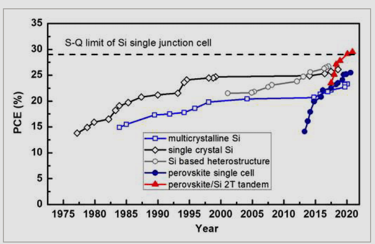Fig. 7, shows the chronology of progress of increasing PCE of perovskite/Si TSC. It depicts how continuous research work has increased the efficiency from 13.4 per cent in 2014 to 29.5 per cent in 2020.