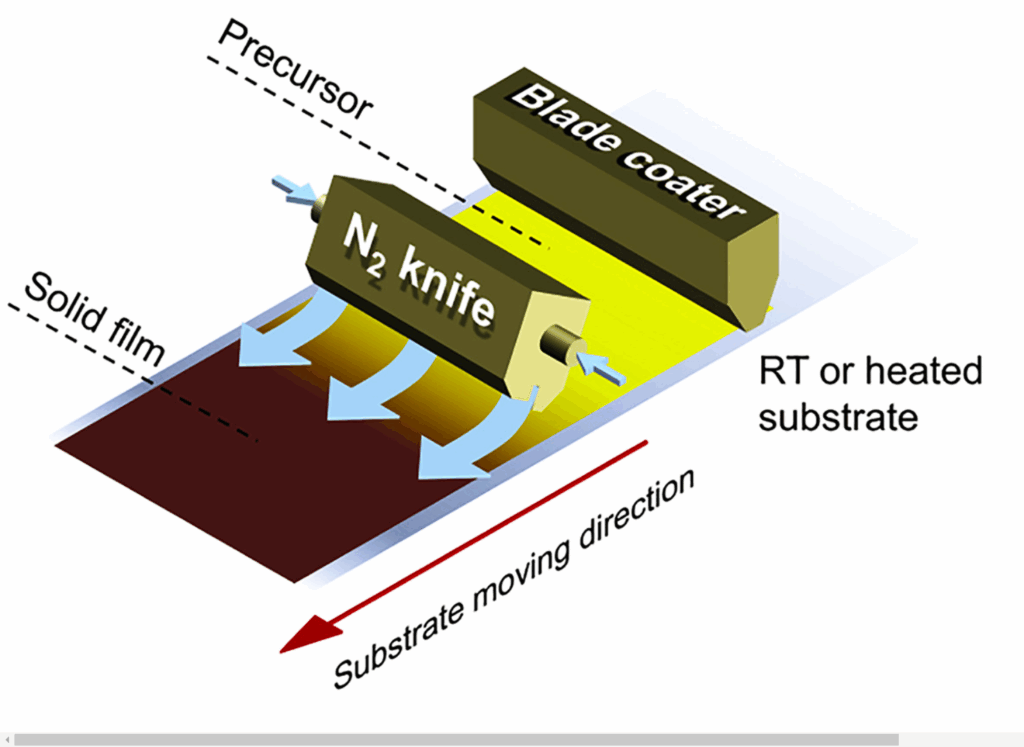 Tandem architecture is achieved via nitrogen-assisted solution-based blading (Fig-13), enabling scalable deposition onto silicon wafers at 1.5 m/min. The PTAA hole transport layer is coated at 25 mm/s on the ITO layer of the Si bottom cell using a nitrogen knife at 50–70°C. A Cs₀.₁MA₀.₉Pb(I₀.₉Br₀.₁)₃ precursor is blade-coated at ambient conditions to form the perovskite active film, followed by thermal deposition of C₆₀ by evaporation and atomic layer deposition (ALD) of SnO₂ at 600°C. The top transparent electrode, IZO, is sputtered onto the SnO₂ layer. To minimise lateral transport loss, 200 nm-wide Ag fingers are sputtered onto the IZO layer.