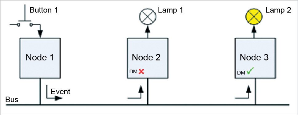 VSCP is event-based. Every time an event occurs, it is broadcast to all other nodes on the network. From there on, each node decides on its own if the event received needs to be processed or not. The final decision depends on the node’s decision matrix, which is made up of a number of ‘if condition> then action> lines’, where the condition> is evaluated based on the fields present in the VSCP datagram broadcast to the network.