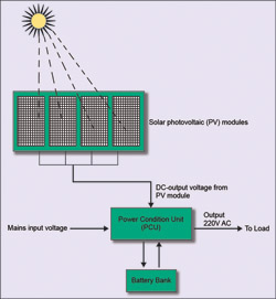 Solar PV module generates DC voltage in proportion to solar panel size and the available sunlight. The power generated in the PV module is sent to the charge control circuit in the PCU. The charge control circuit controls the voltage and current and sends these to the battery bank to charge the battery. The inverter in the PCU processes the 12-24V DC voltage into the required output voltage of 220V AC at 50Hz, which is connected to the load.