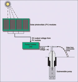 Solar water-pumping system comprises a set of solar PV modules. The PV modules absorb sunlight energy and generate required level of DC voltage and current in proportion to the solar PV modules and available sunlight. The DC output voltage produced by the PV modules is sent to the pump control unit. The pump control unit processes the DC voltage into required levels of three-phase/one-phase AC voltage for the operation of the pumping system. Drive circuits are also integrated in the pump control unit, so no other additional devices are required either to start or run the motor. The system is also equipped with protection circuits to work against low voltage, overvoltage, overcurrent, overheat, etc.