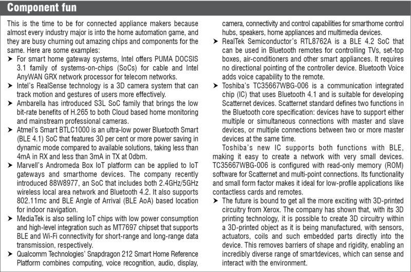 Though it is nice to have a home full of smartdevices, it can be a headache managing these if each one had a separate app and each used a different protocol. “There is no doubt that there is growing popularity of smartdevices, be it wearables, tablets, smartphones, extending to smarthomes and even smartcities. However, these systems are under constant pressure to deliver the correct functionality at the right time, and at the right speed. The challenges these face are power and cost. Though flexibility and adaptability are guaranteed once we shift to these systems, there are issues involved in handing multiple connected devices. It is important that all these devices are connected over a converged Internet Protocol (IP) network. This will help pave the way for interactive, seamless and personalised services,” says Sanjay Gupta, India country manager, NXP Semiconductors. NXP works with ecosystem partners to enable seamless, secure interconnectivity across smartdevices, agnostic to the wireless connectivity protocols used.