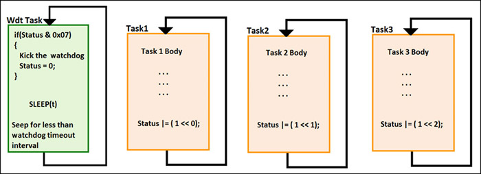 In a multitasking environment, there are a couple of independent loops running in parallel, known as tasks. The scheduler schedules each task based on priority. To validate that each task is running properly, each task must contribute in the decision of kicking the watchdog.